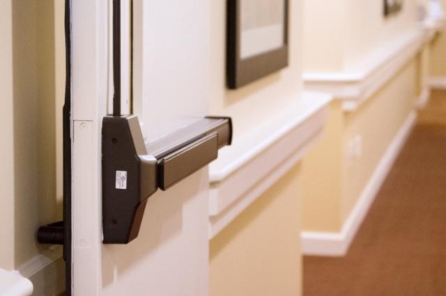 Why is the bottom rod missing?This photo was taken in an assisted living facility here in St. Louis. This opening is a pair of corridor doors and are fire-rated, which means they must positively latch in case of a fire to control flames and smoke from traveling through the facility. Without latching hardware on the exit device itself, positive latching is accomplished with the surface mounted top vertical rod. While it isn’t clear from the picture, the door is being held open with a magnetic hold open tied into the fire alarm. If the fire alarm is activated the hold open will release. The door closer will swing the door shut and the top vertical rod will positively latch the door.