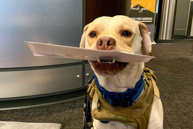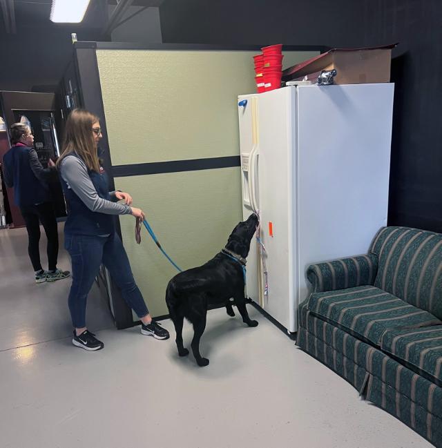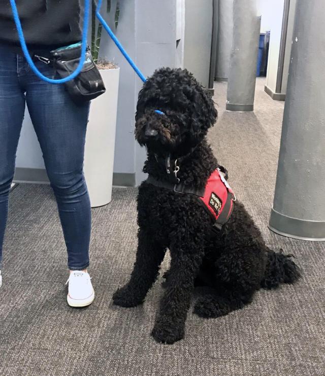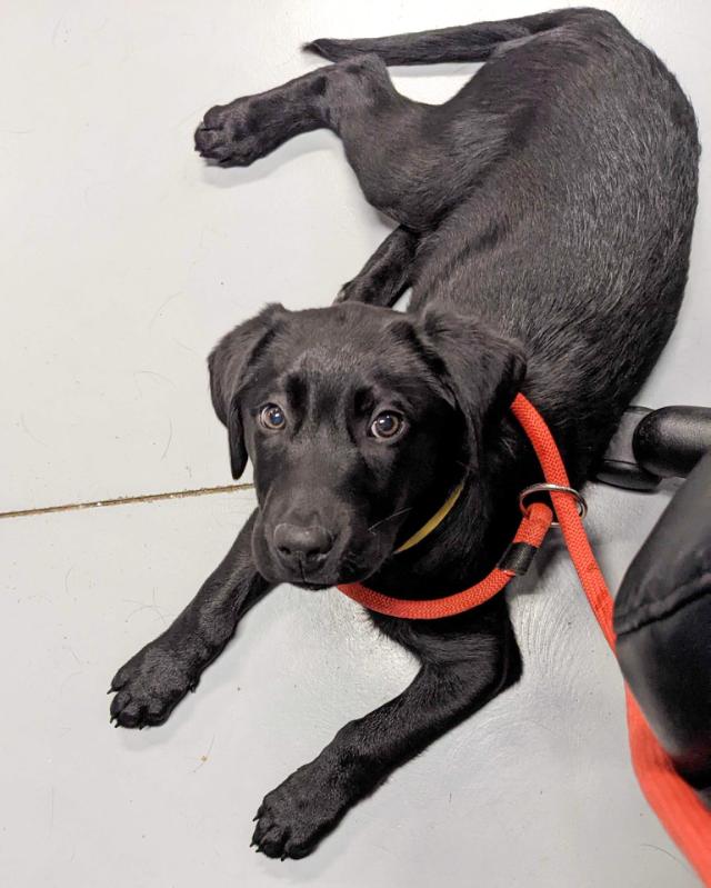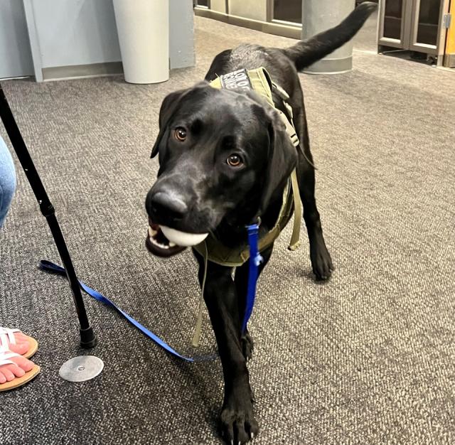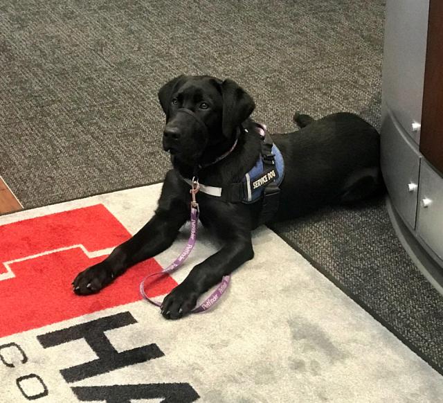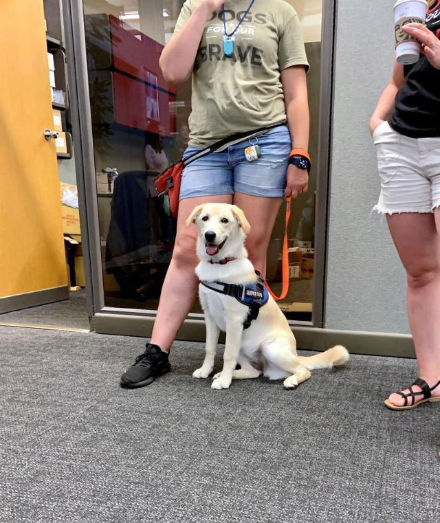 Hager brought smiles to the office today. He is learning to pick up a cane for his veteran and open a refrigerator door to retrieve a bottle of water. He also played with his ball and enjoyed all the attention!